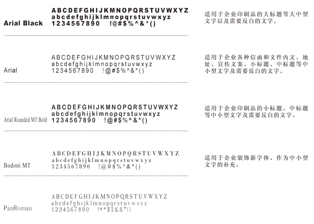 為使視覺形象更加統(tǒng)一,所有傳媒所用文字,均應選用以下規(guī)定字體。字體允許向右傾斜20度,允許長體90%―100%,扁體110%-120%。禁止使用其他字體,特性情況(如節(jié)日、慶典)設計例外。同時,為求得運用方便,在刊物,媒體及封面的排版上,若無相同字體時,可選擇字形相近的字體替代使用。