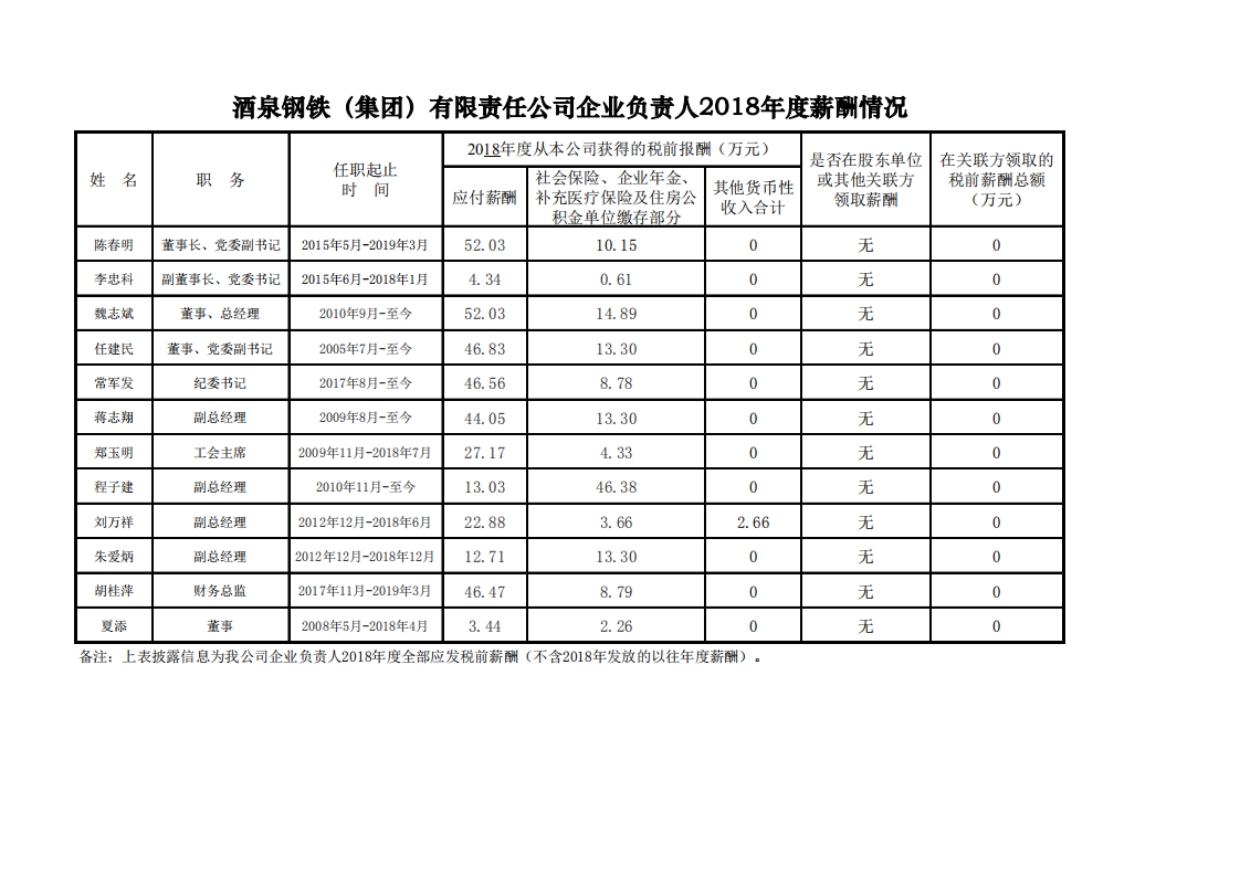 酒泉鋼鐵(集團(tuán))有限責(zé)任公司企業(yè)負(fù)責(zé)人2018年度薪酬情況
